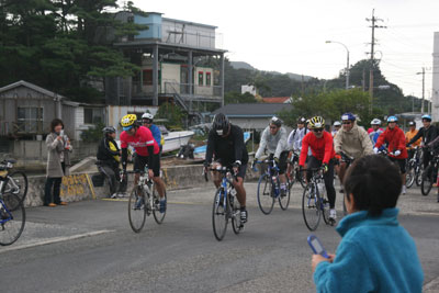 240kmクラスは暗い中の早朝スタートだったようだが、50kmクラスは楽々10時龍郷スタートである。寒空の中、続々自転車が集まる。レースではないので10人ずつ1分毎にスタートである。