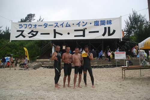 charlieと沖縄君はウェット着用してるので、まぁドングリの背比べ的なチーム編成である。それにしても、微妙に二日酔いだったせいか、吐き気が止まらなかった。このままリレーは泳げないとマジで思ったもんね〜〜。幸い15分ほどで体調回復。島をわたるエキデンは中止になり、そのまま古座間味で競技が行われることになった。しかし、ここでまた雷雨。結局この日のリレーはキャンセルになってしまった。