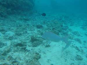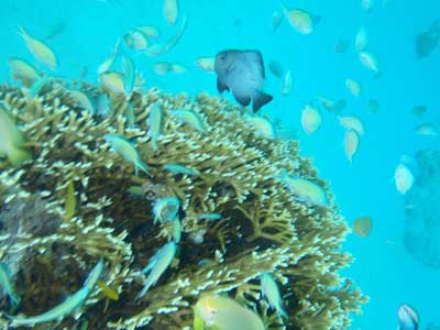 大人数での一斉スタートはかなり迫力がある。ブイにあまり寄らないライン取りで泳ぐ。透明度はさすが座間味だけあって最高である。