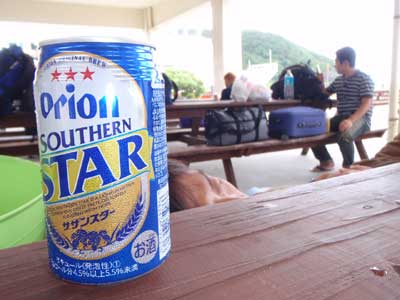 とまりんの売店で、沖縄独特の重たい弁当を買って食べていると、メンバーがぼちぼち集まってきた。夕方5時発のクイーン座間味に乗り込み船旅1時間。あっという間に座間味港に降り立つ。