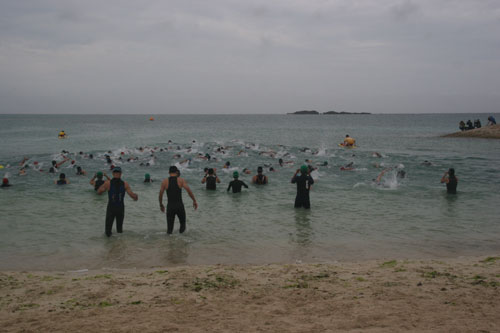 今回charlieは2回目のトライアスロン参加となる。はにおとcharlieJrは初参戦である。相変わらず勝手がわからず右往左往している間にどんどん時間は過ぎ、なんとか曲がりなりにも準備完了。肌寒いが昨日届いたばかりのウェットスーツで完全武装である。