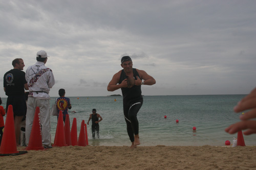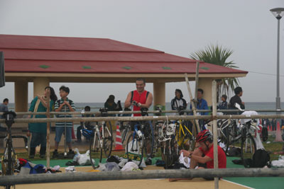 いよいよトランジット。これが最大の問題であった。今朝買ったばかりの上着が着れないのである。どっちが前かどこに腕を通すのか全くわかっていないし、体が濡れているので上手く着れないのだ。もう裸で行かそうかと思ったが、そこらの人に「裸はダメ」と注意され、結局、すべての用意に3分かかり、見事にすべての選手に抜かれてビリになったのであった。さすがビリーズの一員と言うことなのであろう。どうせビリなので開き直って頑張るしかないのである。
