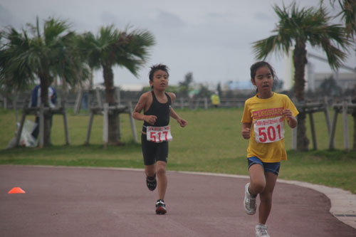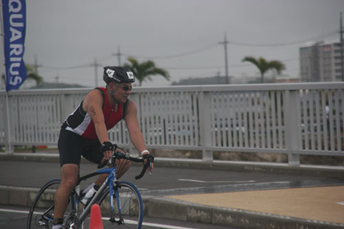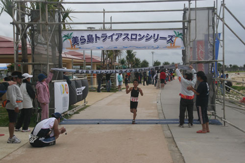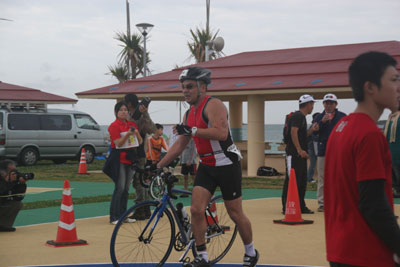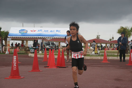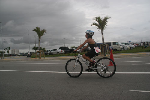 3月29日 前日降り続いた雨もなんとか上がり、舗装路はドライ環境となった。早朝に那覇を出て、西崎からは自走で会場に向かう。7時過ぎにエントリーをすませて、はにおと再会。キッズ用のトライウェアとゼッケンベルトをゲットして用意をすすめる。