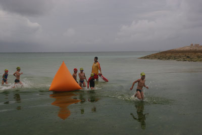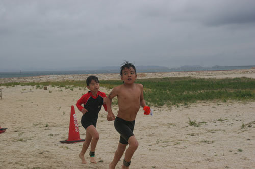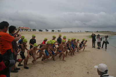 スタートしたのはいいが水深が大人の膝モモなのである。泳ぐより「イルカ飛び」といわれる飛び込みの繰り返しの方が速いのである。こんなんインチキや〜〜〜と思ったが、競技人口のすそ野を広げるためには必要なのかもしれない・・・