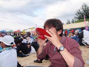 ゴールするとヨモギ汁に足をつけてマッサージを受ける