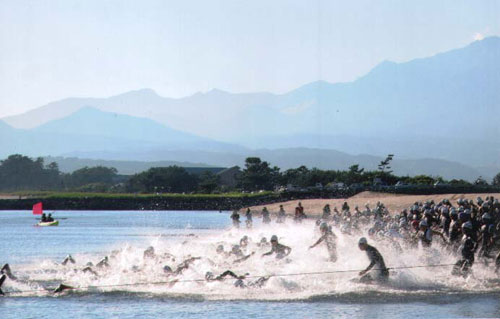 7月18日 晴れ 4時半に目覚ましで起きる。メインのごはんはUFO&おにぎり。初の試み。起き抜けに食べるのにあじくーたーで攻めてみた。ウンコもばっちり。道具をすべて積めた大きなザックを背負い出発。会場はすでにアスリートで賑わっていた。鹿児島県からは3人。元プロサイクリストらしいフリーマントルマークさんとお互いを激励する。着替え袋を下げ、手荷物を体育館に預け、受付してタグを装着し入水チェックで河口の砂州スタート地点に入る。結構ぎりぎりな感じである。試泳をしてみたが、やはり水は冷たい。体が温まれば問題ないだろうと思われた。地元高校の放送部がアナウンスを担当していてキャピキャピした雰囲気である。マークアレンのインタビューなんかもあり盛り上がっている。