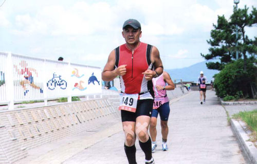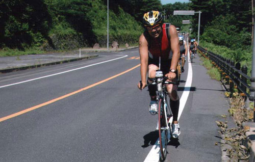気温は35度近くまで上がっているようだ。トランジッションエリアのバイクはすでにいっぱいである。それでもゆっくりと用意する。右足は宮古の時と同じようにかなり痛むが、しっかりテーピングし直す。ゼッケンベルトで走り出そうとすると前面にもナンバーをつけろと注意され仕方なくつけ直す。