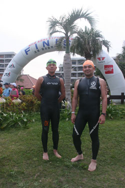白々と夜が明け応援団も到着し、いよいよウェットを着込む。気合いも入ってきたところでふと気づいたのだが、トライパンツの下にブリーフを着て来てしまったのだ。慌てて着替え直していざスイムチェックイン。