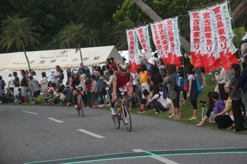 池間島を折り返したとたん向かい風となりどっと速度が落ちる。しかも、橋の端で「1280番」とか叫ばれた。たまたま前に入ってきたバイクのすぐ後方に位置していたので、すっかりドラフティングをとられたと思い意気消沈してしまったが、少し気を取り直してこぎだした。