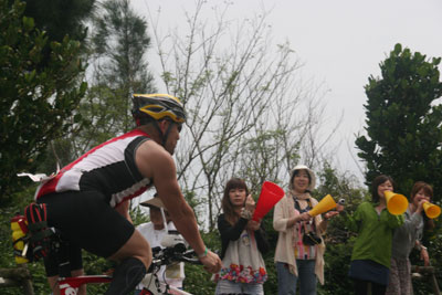 2周目にはいると右のDHバーの腕置きが下がっているのに気がついた。平良で2度目の私設応援団のところで工具を取り出し自分で修理を試みる。しかし、気ばかり焦って余計おかしな方向になってしまった。これはもうメカニックに頼むしかないと思い曲がったまま進むことにする。