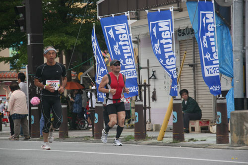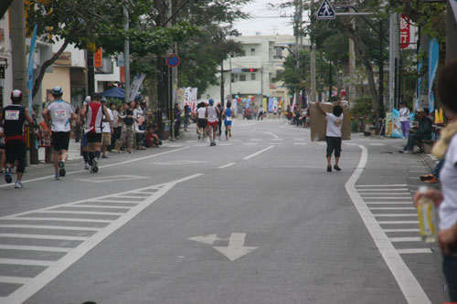 ここからはひたすら抜かれるだけの独り旅。完走めざしマイペースを心に誓う。テーピングと痛み止めが効いてきたのか、小股でちょこちょこ走るなら痛みはさほど気にならなくなってきた。トップの外人選手とすれ違う、なんという速さだ。日本人の活躍を祈りつつ前進する。10kmくらいまでは結構いい感じだったが、上り基調ということもありだんだんと苦しくなってきた。ハムストリングは張ってきているし、呼吸も結構キツイ。折り返しまでは歩かないと心がけるが15kmのあたりではすでに時々歩いていた。名前を呼ぶ人がいたので誰かと思ったらバイクを買ったお店の大塚さんだった。応援の言葉をいただき再度走り出す。