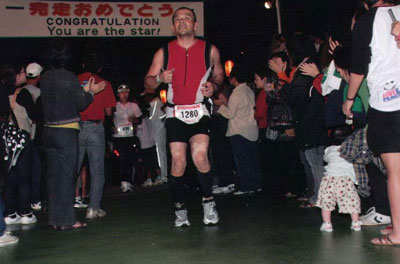 市内に戻ってきた頃には日も落ちてスコールに打たれる。濡れた路面に空港の灯があたりアイアンマンハワイの映像とダブる。小学校の前あたりで1時間前の花火を横目に歩いたり走ったり下っていく。提灯の灯りが並ぶ町中を応援に押されて走る。曲がり角近くではまたしてもmikiさんファミリーに応援してもらった。わざわざ長い時間待っていてくれたのだろう。感謝である。