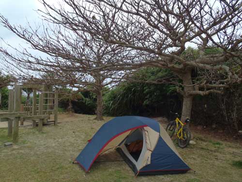 3月19日 早朝から下りのなみのうえに乗り、2時過ぎに初めての沖永良部上陸。すぐにバイクで笠石海浜公園に移動しテント設営。奄美から同行してくれたスーパーアスリート達がペグを打ってくれる。