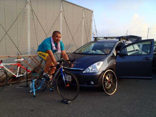 大会の前にローラー台。初めての試みである。心拍計は持ってないし、感覚で2度ほど追い込む。15分くらい回したかな。すでに汗だく。