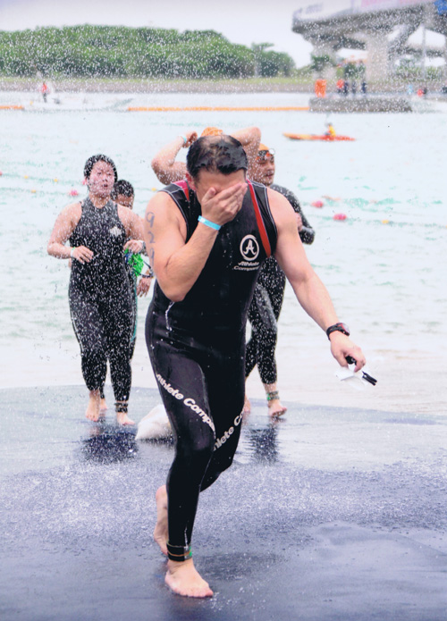 トランジションエリアまで少し距離があるのがこの大会の特徴だ。300mくらい裸足で走る感じかもしれない。巨体を引きずりノロノロと走る。