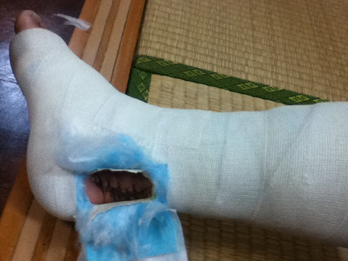 9月11日 術後1週間目。ギプスをカッターで外す。熱で溶かすタイプの奴でちょっと怖い。開いてみるとふくらはぎのあたりはホッチキスで留めてあり、創もきれいなのでその場で抜釘(表現が正しいかどうかわからない) そして核心の足首部分はきっちり引っ張って縫ってあった。そして、足首の角度を少しきつくして再度ギプス固定。ひとつ前進した気分になれてとても嬉しい。